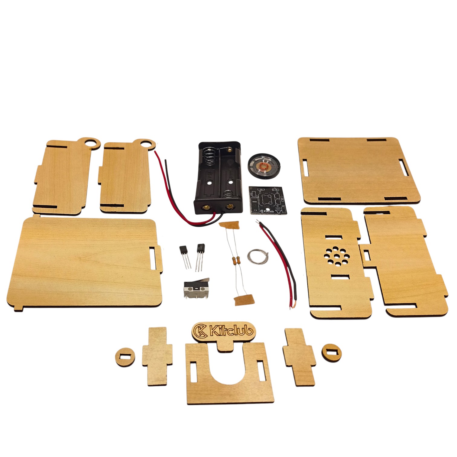 راهنمای کامل مونتاژ، قطعات چوبی برش خورده با لیزر، برد، جاباتری، بلندگو، سیم لحیم و سایر قطعات الکترونیکی |